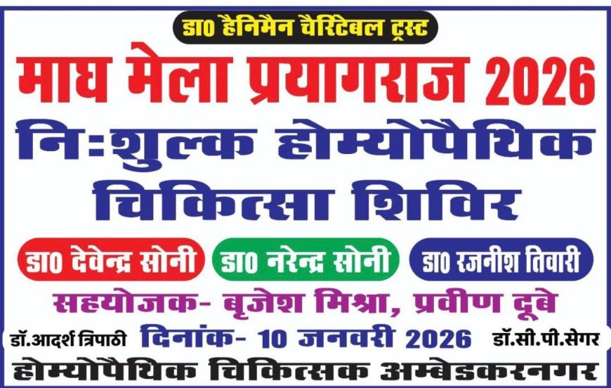 प्रयागराज/अम्बेडकर नगर,अचल वार्ता। माघ मेला प्रयागराज के दौरान श्रद्धालुओं और आमजन की स्वास्थ्य सेवा को ध्यान में रखते हुए अंबेडकर नगर के डॉ सोनी होम्योपैथी द्वारा एक दिवसीय निःशुल्क होम्योपैथिक मेडिकल कैंप का आयोजन किया गया। यह शिविर मुख्य मेला अधिकारी रंजीत सिंह के संरक्षण में संपन्न हुआ।