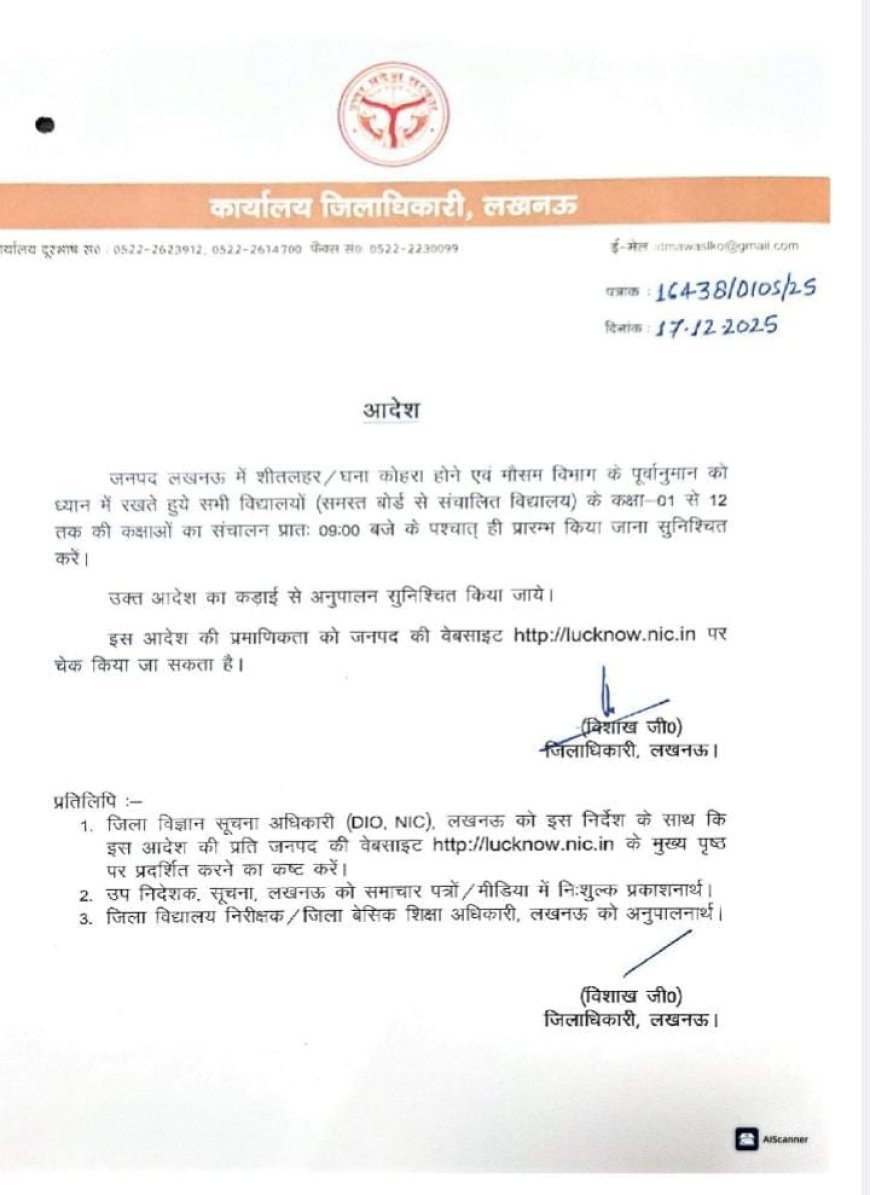 घने कोहरे व जबरदस्त शीतलहर के चलते लखनऊ में कक्षा 1 से 12 तक के सभी स्कूल सुबह 9 बजे के बाद खुलेंगे, डीएम विशाख जी ने इस आदेश का सख्ती से पालन कराने के निर्देश दिए हैं। बच्चों की सुरक्षा सर्वोपरि है।