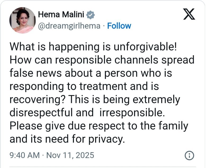 हेमा ने अपना गुस्सा जाहिर करते हुए लिखा- जो कुछ हो रहा है वह माफ करने लायक नहीं है। कैसे जिम्मेदार चैनल ऐसे व्यक्ति के बारे में झूठी खबरें फैला सकते हैं जो इलाज पर अच्छी तरह प्रतिक्रिया दे रहा है और स्वस्थ हो रहा है ? यह बेहद असम्मानजनक और गैर-जिम्मेदाराना व्यवहार है। कृपया परिवार और उनकी निजता की आवश्यकता का सम्मान करें।