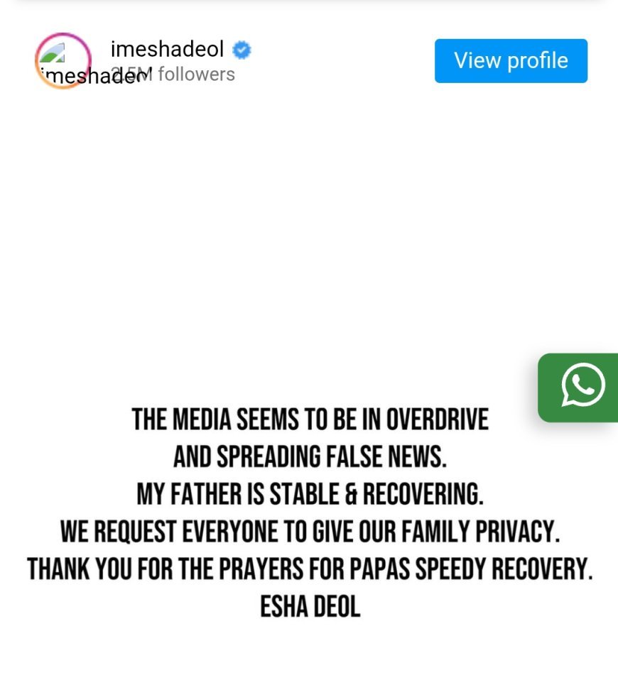 ईशा ने लिखा- मीडिया लगातार झूठी खबरें फैला रहा है, मेरे पिताजी स्थिर हैं और स्वस्थ हो रहे हैं। हम सभी से अनुरोध करते हैं कि हमारे परिवार को कुछ निजी समय दें। पापा के शीघ्र स्वस्थ होने के लिए की गई प्रार्थनाओं के लिए धन्यवाद।
